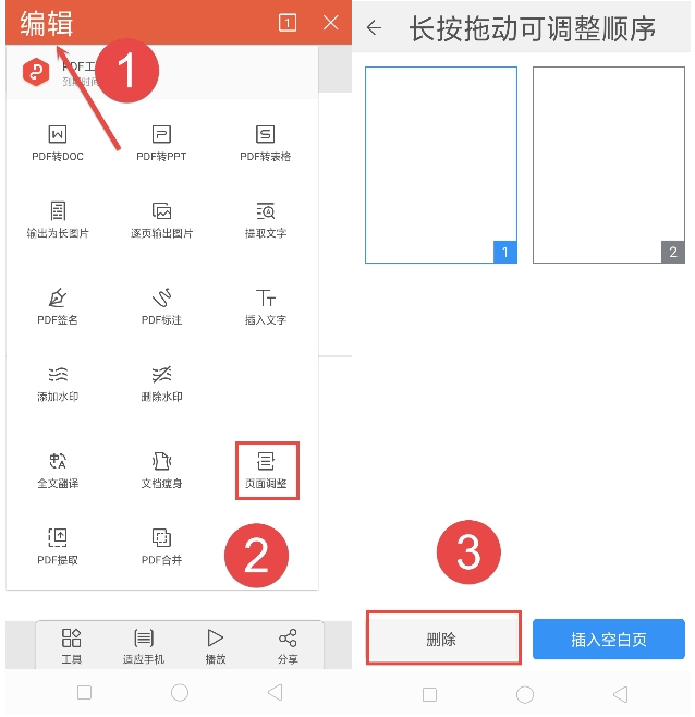 打开PDF文档,点击左上角「编辑」,选择「页面调整」,点击进去选中需要删除的空白页,左下角点击「删除」