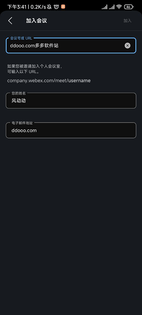 进入【加入会议】界面后,我们需要输入我们的会议号或者会议URL,然后填写自己的姓名和电子邮箱,最后点击右上角亮起来的加入就可以了。