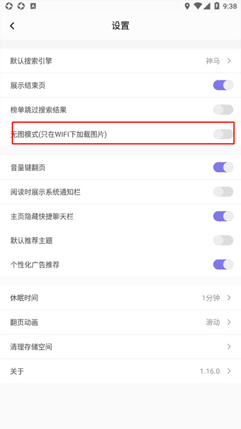 来到设置界面,然后把【无图模式】的按钮开启即可。