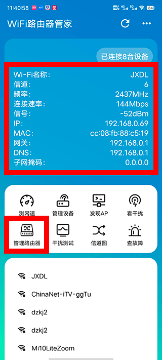 1、下载安装app并进入首页。2、在首页你可以看到连接的WiFi的各种信息,选择“管理路由器”进入。