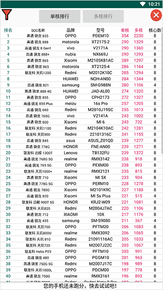 您的跑分数据将会被上传到软件数据库中,与他人共享。您也可以通过查看您在排行榜中的位置来了解您的手机的大致性能。