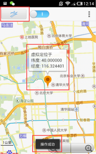 6、点击左上角的神行者按钮,图标出现气泡文字显示经纬度,界面下方出现「操作成功」提示。恭喜你,你已经定位成功!
