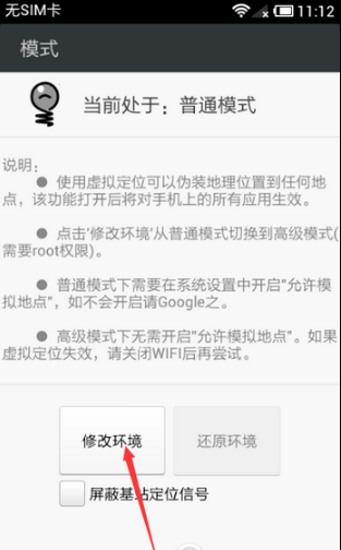 8、如图,选择【修改环境】选项就可以从普通模式切换到高级模式了,以上就是神行者虚拟位置软件的使用方法了。