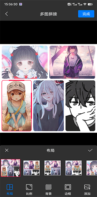3、拼图时,你还可以选择其它喜欢的布局,也可以更换背景、比例、边框等等,还可以点击单张图片进行编辑哦;