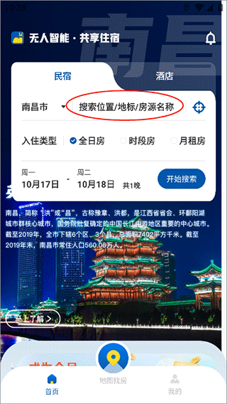 2、点击搜索栏可搜索你想入住的位置地标房源名称,软件会智能寻找附近的房源
