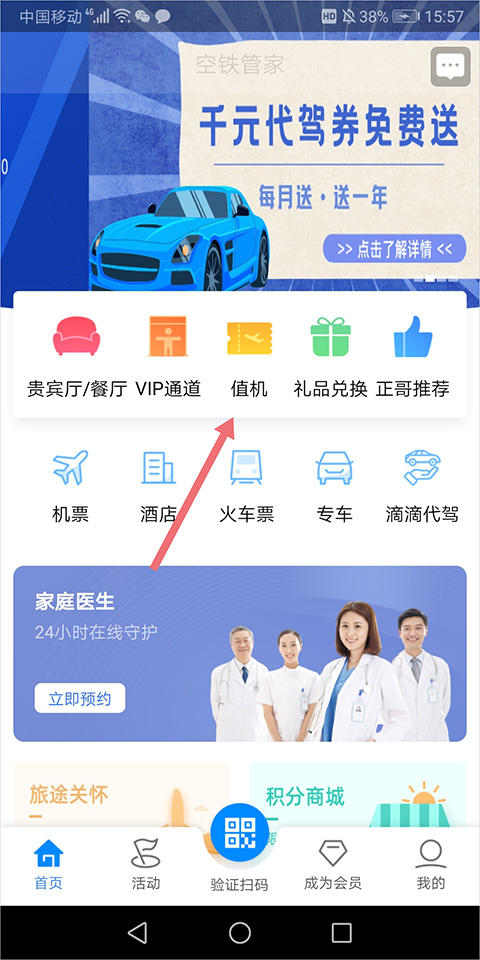 1、用户打开并登录空铁管家app后进入首页点击【值机】