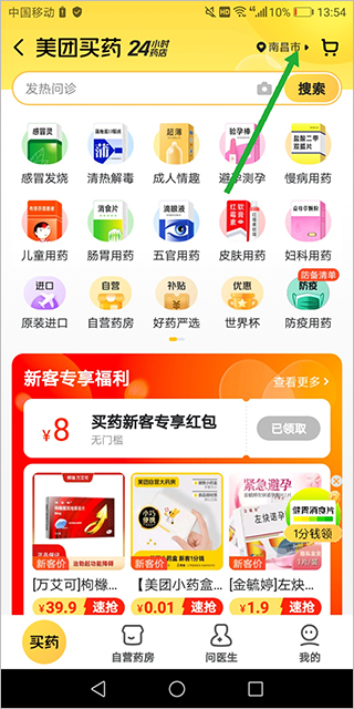 如果用户所在城市没有开通医保支付就没有这【医保支付】专栏,下图是南昌市的页面(注意页面右上角绿色箭头所指的地区)没有【医保支付】专栏代表南昌市没有在美团买药上开通医保支付方式