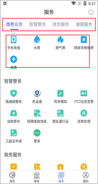 3、在服务这里还可以进行缴费业务、健康服务等;