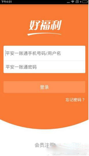 1、下载安装平安好福利app,打开软件,进入登录界面,如果你有平安一账通的账号,可以直接使用,否则点击会员注册