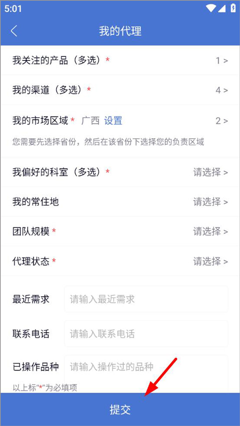 4、进入我的代理发布页面,用户根据自己的需求填写产品、渠道、市场区域、科室、团队规模等,填写完成后点击提交即可查找相关产品。