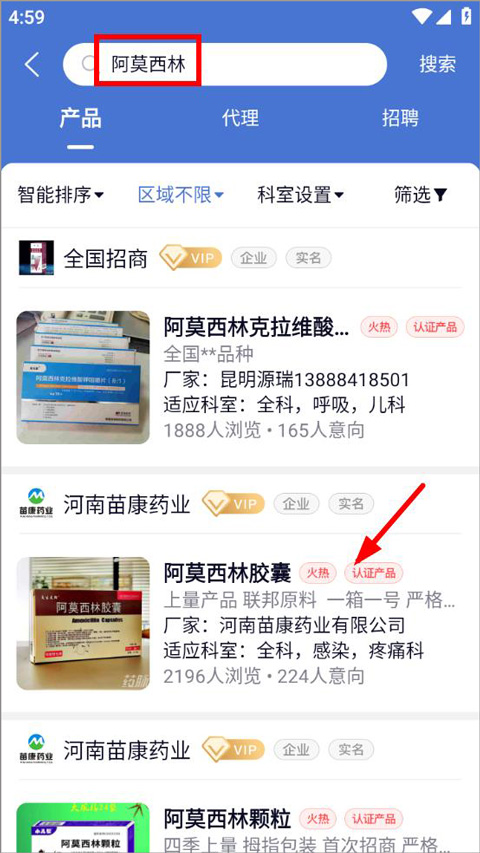 2、输入产品名称搜索后,用户可看到相关产品企业,选择合适的产品打开即可;