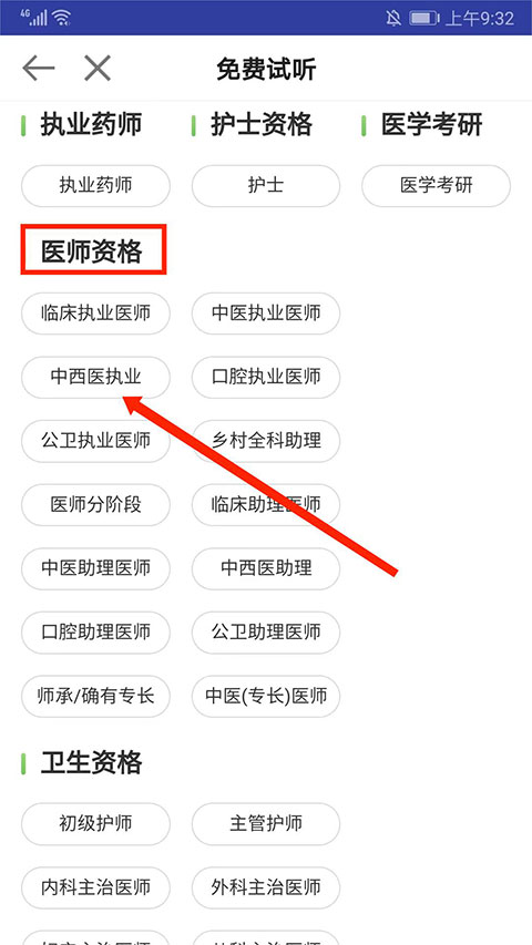 3、选择需要下载的视频类型,这里以“医生资格”中的“中西医执业”选项为例,