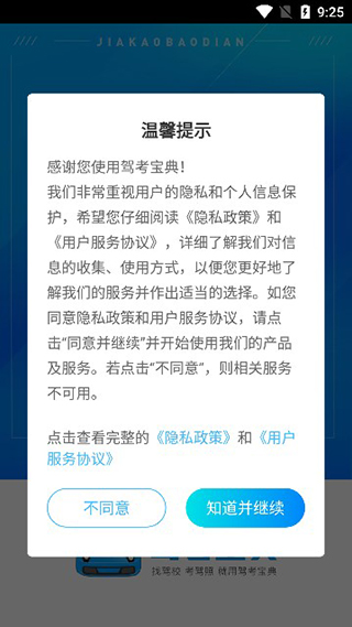 1、下载安装本站提供的驾考宝典,进入软件后想同意下用户协议;
