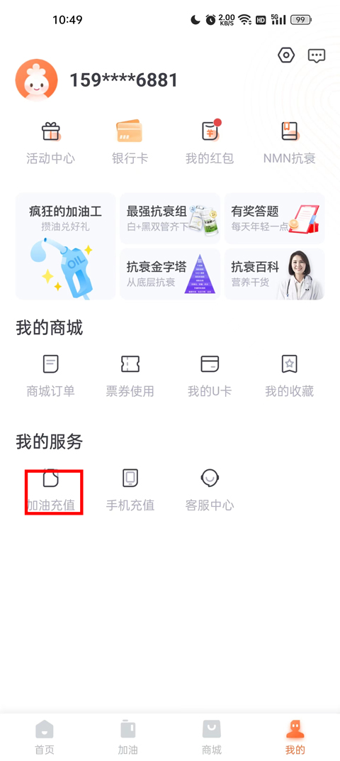 3、进入到我的页面之后,在我的服务中有一个【加油充值】的端口,点击进入;