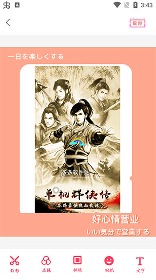 2、你可以对照片进行编辑,例如裁剪、添加滤镜、添加相框、添加贴字、文字等,编辑好点击保存就可以了。