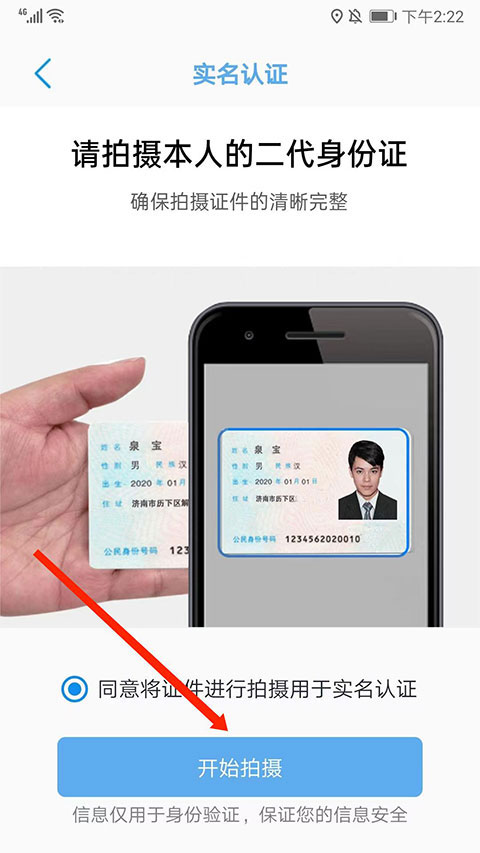 2、进入实名认证界面,勾选“同意”后,选择下方“开始拍摄”选项,