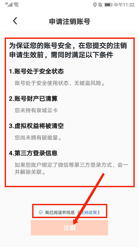 4、阅读完注销说明后,勾选下方“我已阅读并同意”,最后选择“注销”即可。