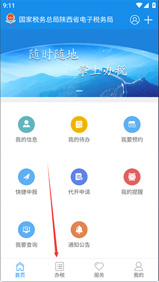 1、通过本站下载陕西电子税务局app并打开登录,在下方选择【办税】功能进入;