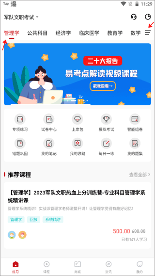 1、用手机号和验证码注册登录账号,进入到软件主页面【练习】模块,你先观察页面上排在第一位的科目是哪一个:管理学,了解了之后点击点击右边红色箭头指向的位置。