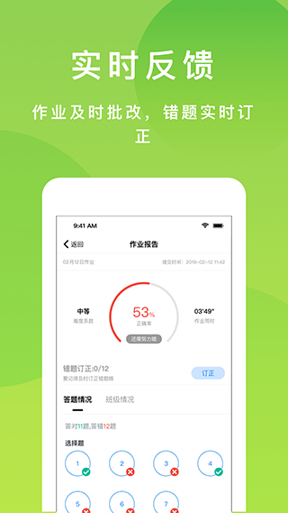 1、作业布置与管理知识点、难度系数、难度曲线,三位一体锁定高精习题,一键下发自享个性化。轻轻一点,自动批改海量作业!