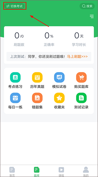 2、进入【题库】页面,点击右上方选择需要刷题的类型;