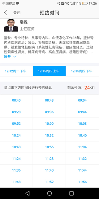 6、患者选择医生,以及合适的挂号时间后点击(此页面可显示“仅可约医生”,需点击下图红色方框内的开关按钮进行切换)