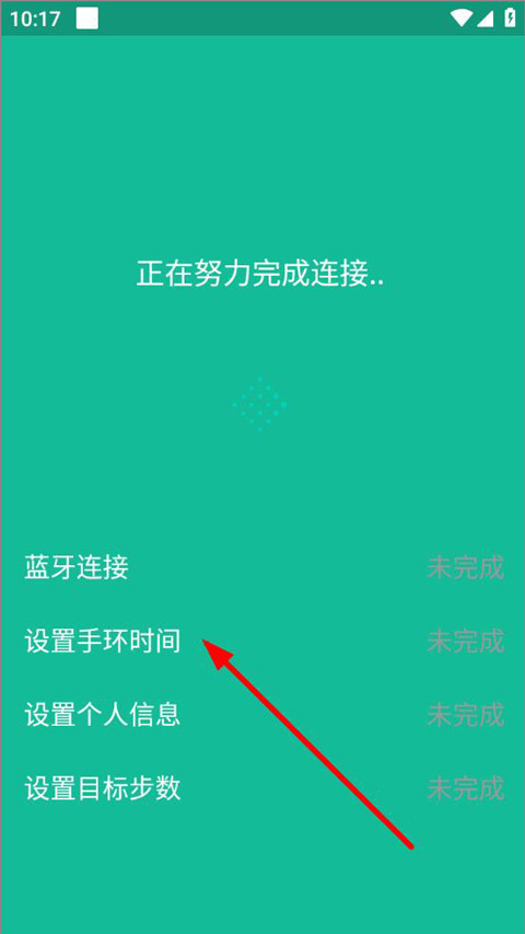 4、进入连接页面,用户需要设备蓝牙连接、设置手环时间、个人信息、目标步数等,设置完成后即可绑定设备。