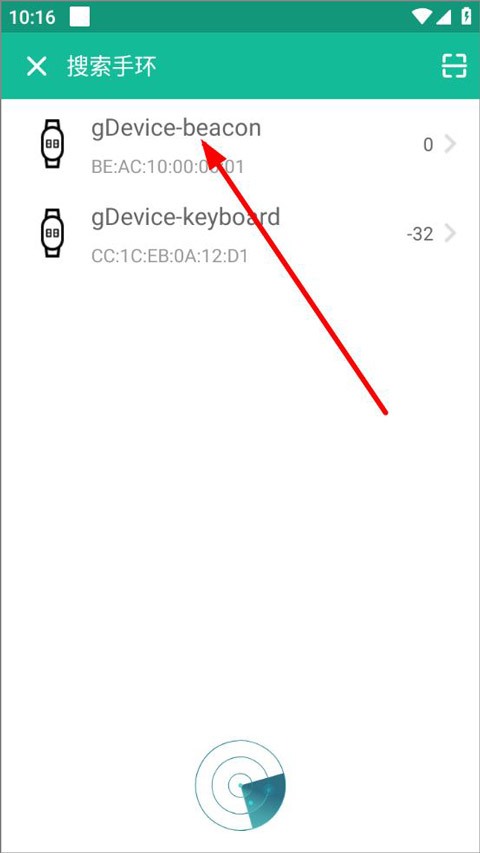 3、进入搜索手环页面,软件自动搜索识别手环,点击识别到的手环连接绑定;