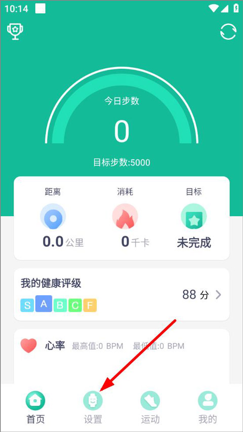 1、打开fitpro手环app,登录进入首页,首页可以查看每日运动步数、心率、健康等级等,点击设置;
