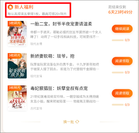 每天在app中阅读小说,达到一定时长就可以获得相应的碎片奖励。奖励呈阶梯式增长,每天阅读满3个小时可以获得最高的阅读奖励,总计5块碎片。