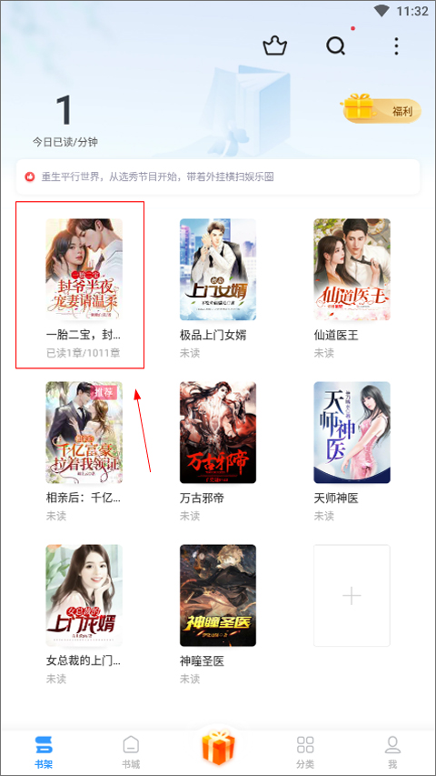 1、首先打开疯读小说极速版,点击【书架】,找到一本要看的小说;