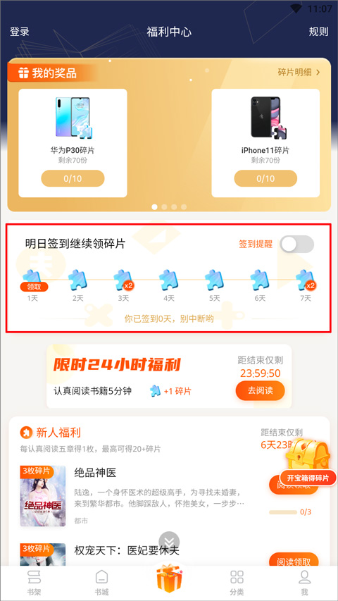 在疯读小说中,集齐10块碎片,就可以兑换华为P30手机。