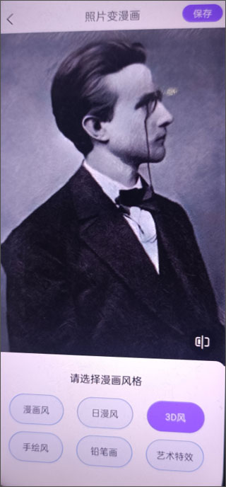 2、在相册中选择一张照片,然后选择漫画的风格,弄好之后点击右上角的保存按钮即可。