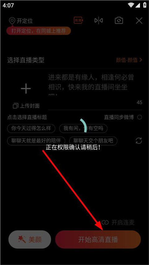 3、完成实名认证后,用户打开直播页面,可开启定位,选择直播类型、上传直播封面、直播标题等,点击开始高清直播即可。