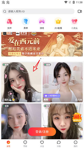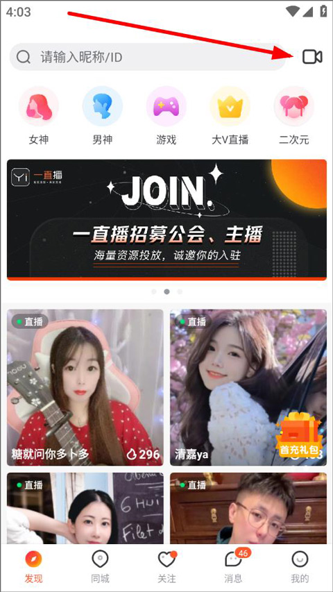 1、打开一直播app,登录进入首页,用户在首页可观看男神女神直播、游戏直播、大V直播等,点击右上角摄像标志发起直播;