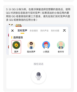 4、以 QQ 分身为例,在悬浮弹窗选择您想要的音色后,使用QQ 对讲按住语音进行实时变声(如果添加的分身应用内要用到QQ或者微信的第三方登录,请先在我们实时变声内登录QQ或者微信的应用分身)