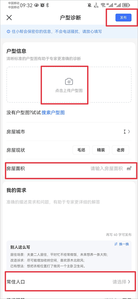 3、最后在户型诊断中点击上传户型图,并将户型面积、需求、常驻人口、装修预算填写完成后点击右上角发布即可