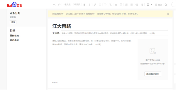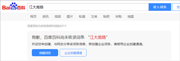 2、如果这个词条确实尚未被百科收录,你可以在搜索结果页或者百度百科首页点击“创建词条”,把这个词条创建出来。例如可以创建‘’江大南路“ 这个词条