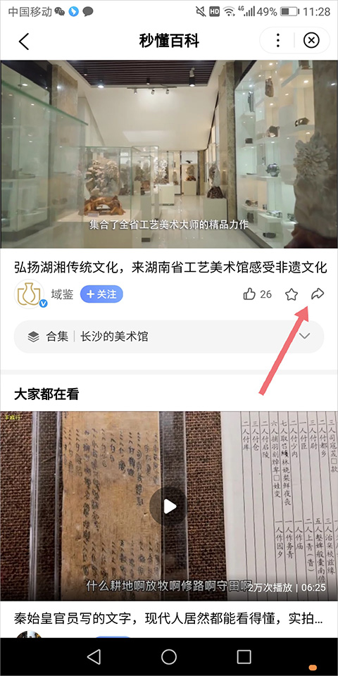 1、首先进入百度百科app的秒懂视频,选择一个视频点击进去,在视频播放页面的底部右侧有个分享小图标(下图红色箭头所指区域),用户点击这个小图标