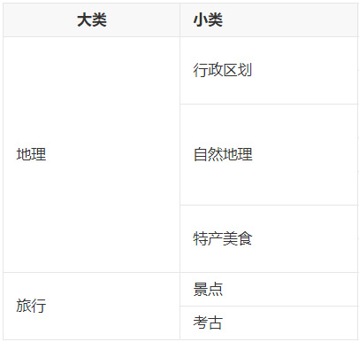 其中各大目录分类中又来很多具体大类,大类中又包含具体小类,下面以第1个目录分类“地理与旅行”作为示例,其具体分类如下表所示