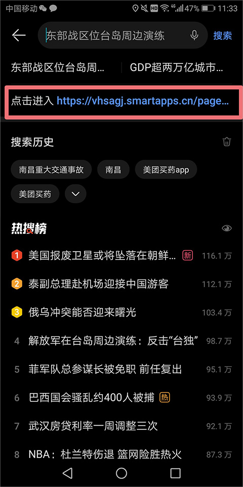 3、用户打开手机浏览器,将链接地址复制在浏览器中的搜索框中,或长按搜索框,会出行如下图红色方框中区域的文本信息