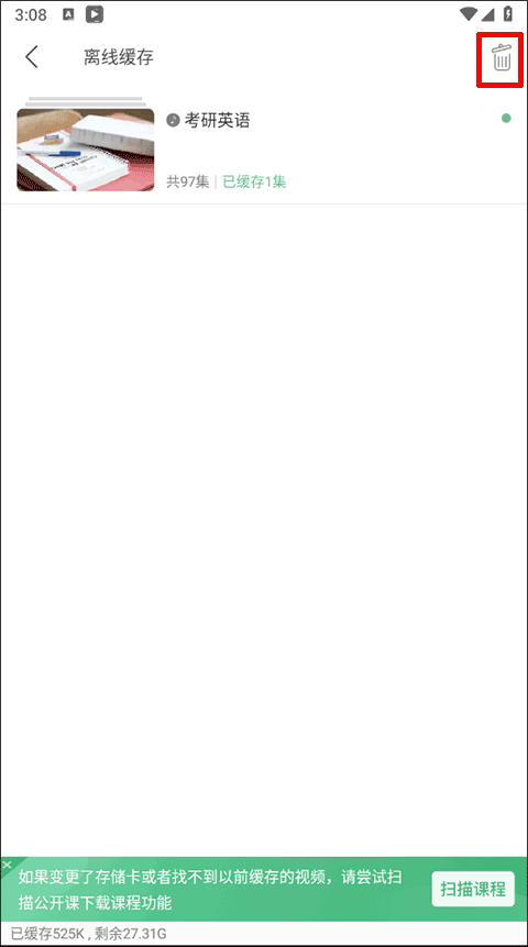 4、在离线缓存当中点击右上角的垃圾桶图标;