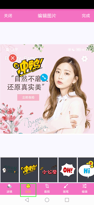 6、在为你的图片添加了“冲鸭”类似的小贴纸后,找到并点击右上角的“完成”;