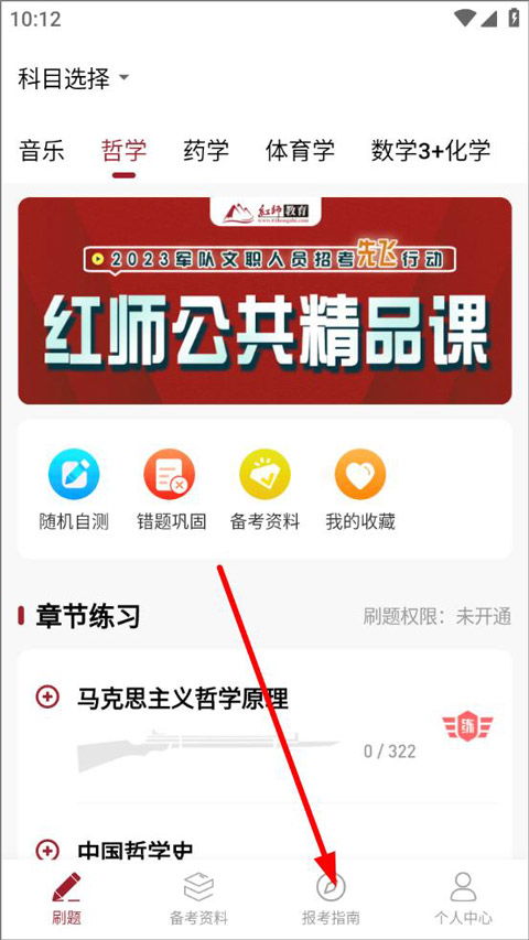 1、打开app,进入刷题页面,用户可根据科目选择题库练习,题库中的科目章节练习题是免费的,点击报考指南;