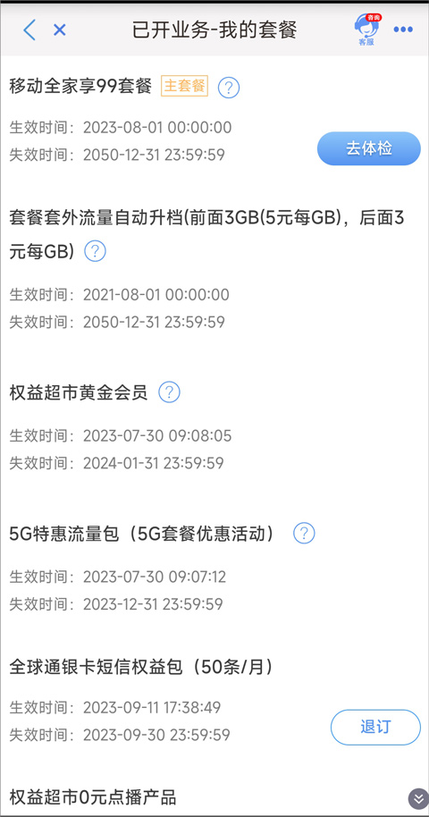 3、进入已订业务后用户可以查看所有办理业务,选择退订或者变更套餐即可(若部分已订套餐业务后无退订按钮,用户可致电中国移动取消)。