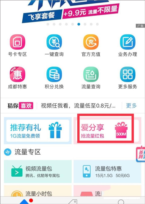 1、用户在本站下载并打开中国移动四川app,登录进入首页,首页可以进行一键查询、办宽带、订流量等,用户点击更多服务;