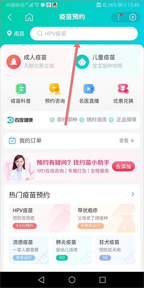 1、用户使用百度账号或手机号登录百度健康app(即百度app)进入百度健康页面后点击如下图绿色箭头所指的【疫苗服务】