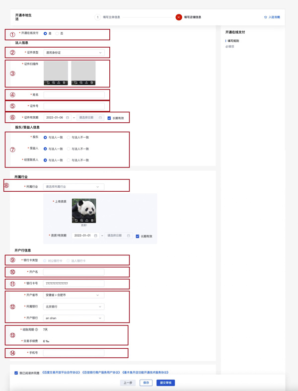 此部分填写内容包括“商户信息”和“店铺信息”;一个账户仅支持一个商户信息,一个商户下可以挂载多个店铺,类似分店的概念。例如:商户名为“百度集团”,店铺名称可叫做“百度总部”、“百度北京”、“百度上海”等等;