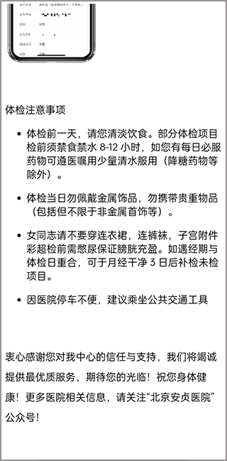 1、体检前一天,请清淡饮食。部分体检项目前须禁食禁水8-12小时,如由每日必服药物可遵医嘱用少量清水服用(降糖药物等除外)。2、体检当日勿佩戴金属饰品,勿携带贵重物品(包括但不限于非金属首饰等)。