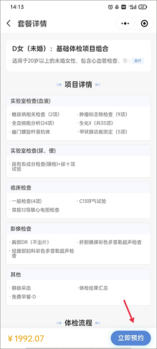 5、仔细阅读项目详情和注意事项后,点击立即预约,填写体检人相关资料,在选择体检报告的获取方式后,点击确认预约即可。